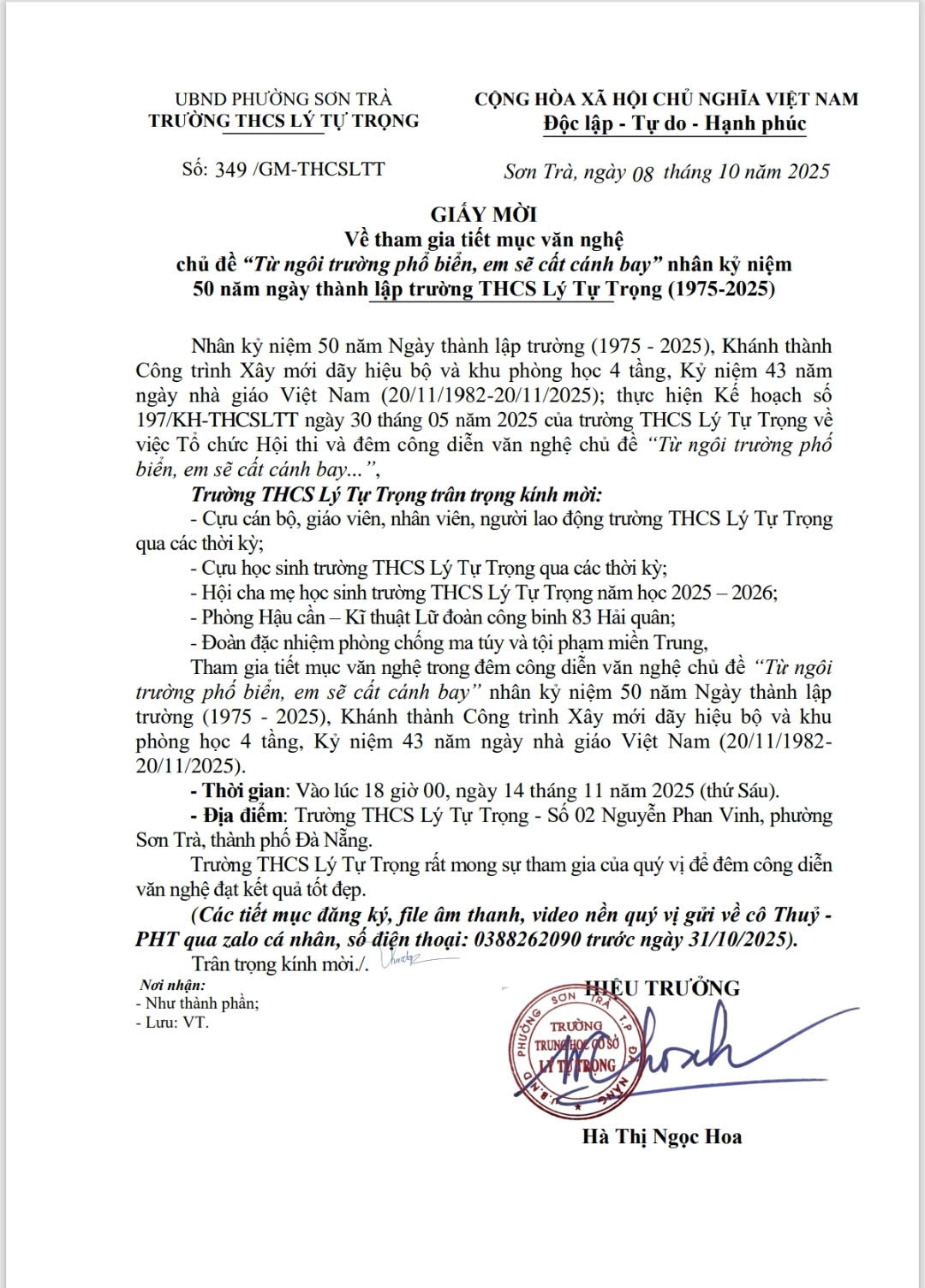 - Thư mời dự Lễ kỷ niệm 50 năm Ngày thành lập trường THCS Lý Tự Trọng (1975 - 2025) (10/06/2025)